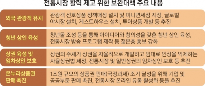 투어상품과 사후면세점, 게스트하우스 설치 등 중국인 관광객(유커)을 비롯한 외국 관광객을 전통시장으로 유인하기 위한 다양한 대책이 추진된다. 상인 고령화를 감안해 청년 상인 육성책도 마련됐다.