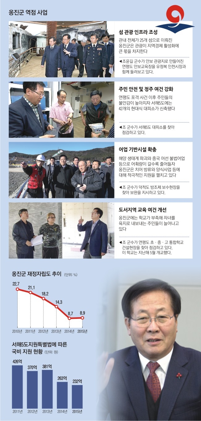 조 군수는 어업소득 증대 등 주민 생계와 관련된 ‘디테일’한 부분에도 신경을 많이 쓴다. 옹진군은 치어 방류와 양식사업에 대한 적극적인 지원, 해양 생태계 개선, 해적생물 구제, 체험어장 확대 등에 주력하고 있다. 특히 중국어선 불법 조업으로 어려움을 겪는 어민들을 위해 서해5도 조업구역 확장을 당국에 건의해 관철시켰다. 조 군수는 “옹진군은 현안이 산적해 있지만 가장 중요한 것은 관광 인프라 구축과 서해5도를 평화지대로 만들어 다시는 연평도 피격과 같은 불행한 사태가 일어나서는 안 된다는 것”이라고 강조했다.