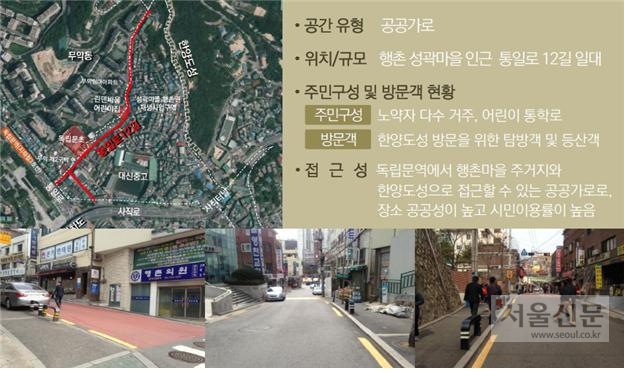 일단 서울시는 행촌 성곽마을과 금천구 독산1동 공공건물을 시범사업으로 선정했다. 행촌 성곽마을의 통일로 12길 645m는 보행자 중심의 디자인을 적용한다. 이 길은 오르막에다 차량과 사람이 구분없이 다니고 있어 걷는데 어려움은 물론 주민의 안전도 위협받고 있다. 특히 이 지역 주민들의 25%가 노인이라 보행 환경 개선이 시급하다. 시 관계자는 “경사가 있는 오르막길 중간에 노인들이나 한양성곽을 찾는 관광객이 쉴 수 있는 의자를 만들고, 차량과 사람이 섞여 다니는 8~10m 폭의 길도 정비할 것”이라고 말했다. 행촌 성곽마을 길은 지하철 3호선 독립문역과 연결돼 한양도성 인근까지 연결된다. 시는 보행로를 정비하면서 행촌마을의 지역 특성을 보여줄 수 있는 ‘가로(街路) 브랜드’ 개발도 추진한다.
