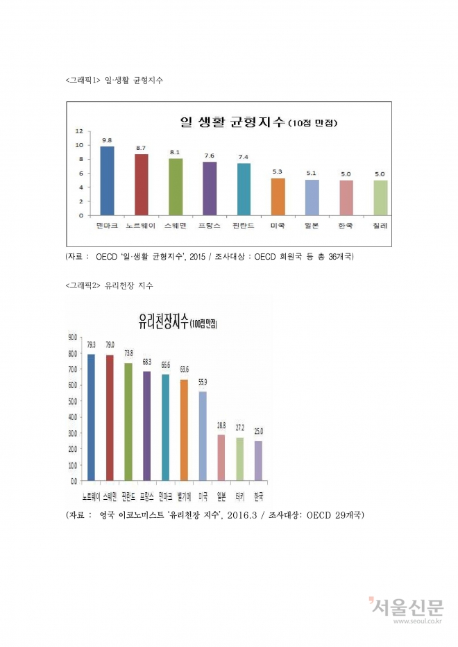 경제협력개발기구(OECD) 국가 중 여성이 일하기 가장 어려운 나라. 한국의 직장 내 여성차별이 세계 최고 수준에 머물고 있다. 우리나라의 일·생활 균형 수준은 세계 36개국 중 33위(10점 만점에 5점)로 하위권이다. 직장에서의 여성 차별을 상징하는 소위 ‘유리천장’ 지수의 경우 OECD 29개국 중 꼴찌(29위·100점 만점에 25점)를 기록했다.