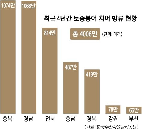 경남도와 전북도, 충남도는 최근 4년간(2012~2015) 강 등에 풀어놓은 토종붕어 새끼만도 1068만 마리, 814만 마리, 487만 마리에 이른다. 같은 기간 전국에 방류한 붕어 새끼는 모두 4006만 마리였다. 개체수도 갈수록 급증할 것으로 보인다. 새끼를 방류한 뒤 2년 정도 지나면 산란 가능한 성어로 커 연간 1만~1만 5000개의 알을 낳는다.
