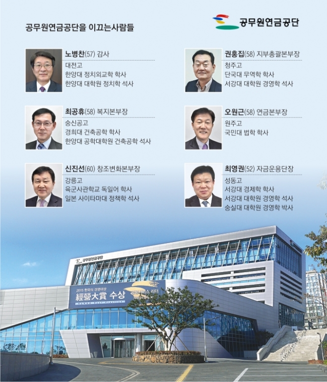 오원근(58) 연금본부장은 1977년 총무처를 시작으로 1983년부터 30여년을 공단 맨으로 몸담았다. 연금사업실장, 감사실장, 서울지부장을 거쳤다. 연금업무 실무형 전문가로 올해 개정된 연금법의 정착과 공무상 재해보상 제도 개선에 앞장서고 있다. 최영권(52) 자금운용단장(CIO)은 2014년 외부에서 영입한 투자운용 전문가다. 동양투자신탁 주식운용부장, 국민은행 신탁부 자산운용총괄(부장), 플러스자산운용 전무를 지냈다. 공무원연금기금 중 주식, 채권, 대체투자, 예금을 총괄하며 기금의 안정적 운용을 통한 유동성 자금 확보를 도맡았다.