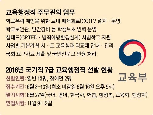 올해로 2년차인 이 주무관의 업무는 ‘학교폭력 예방을 위한 교내 폐쇄회로(CC)TV 설치·운영’, ‘학교보안관, 민간경비 등 학생보호인력 운영’, ‘셉테드(CPTED·범죄예방환경설계) 시범학교 지원 사업’ 등이다. 올해 셉테드 시범학교는 모두 100곳이다. 교육부의 주요 정책 과제 중 하나인 ‘제3차 학교폭력 예방 및 대책 기본계획(2015년~2019년)’에 포함된 업무다. 기본계획은 학교 폭력이 단순히 피해자와 가해자 간의 문제가 아닌 국가 사회적 문제로 인식되면서 가정에서 학교로, 학교에서 사회로 이어지는 폭력 문화를 개선하자는 취지로 수립됐다. 이 주무관은 “예산 편성을 포함한 사업별 기본계획을 만든 뒤 교육청과 학교에 안내해 사업이 잘 진행될 수 있도록 지속적으로 관리해 나가는 역할을 담당한다”며 “사업과 관련된 국회 요구자료나 국민신문고 등으로 제출된 민원을 처리하기도 한다”고 설명했다.