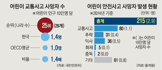 2014년 한 해 동안 어린이 215명이 사고로 숨졌고, 이 가운데 80명이 교통사고로 사망했다. 10명 가운데 4명꼴이다. 정부는 교통사고 피해를 줄이기 위한 대책으로 ‘카시트 착용’을 강화하기로 했다. 교통안전공단에 따르면 우리나라 6세 미만 어린이의 카시트 착용률은 40%에 그친다. 미국(91%), 일본(60%) 등에 크게 못 미치는 수준이다. 안전처 관계자는 “선진국에는 차량에 카시트가 없으면 영유아를 아예 태우지 못하도록 하는 규정도 있다”고 설명했다. 카시트 착용률을 높이기 위해 미착용 시 과태료를 현행 3만원에서 2배 이상 인상하고, 경찰 단속을 강화하기로 했다. 이를 위해 안전처는 연내에 도로교통법 시행령 개정에 착수할 방침이다.