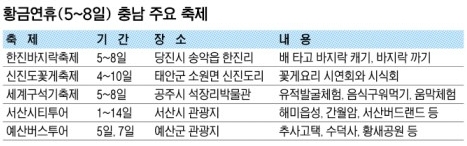 풍족한 바다와 농경지가 펼쳐진 충남 곳곳에서 어린이날부터 이어지는 황금연휴에 갖가지 축제들이 한바탕 벌어진다. 서울 등 수도권에서 가깝다는 이점에다 오감을 만족시킬 축제들이 관광객들을 한껏 유혹하고 있다.