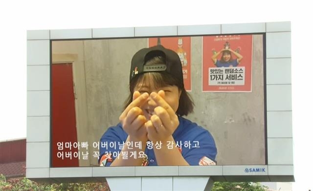 가족에게는 이런 애정 표현을 하고 싶은 마음이 굴뚝같아도 쑥스럽고 민망한 탓에 쉽게 말하기 어렵다. 용산구가 지역 주민을 위해 특별한 이벤트를 준비했다. 전광판을 통해 가족에 대한 고마움과 사랑을 전달할 수 있도록 한 것이다. 구는 가정의 달인 5월 한 달 동안 주민들의 사연을 구청 광장의 대형 전광판(가로 7m, 세로 4m)을 통해 내보내고 있다고 11일 밝혔다. 이 전광판은 평소 구정 소식이나 주요 정책 등을 알리는 데 활용했다.