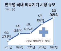 고령화로 건강과 미용에 투자하는 사람이 늘면서 의료기기 시장이 고속 성장하고 있다. 지난해에는 의료기기 생산실적이 처음으로 5조원을 돌파했고, 시장 규모는 2014년 이미 5조원을 넘어섰다.