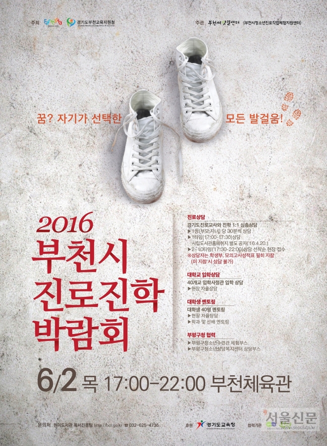 경기 부천시는 다음 달 2일 부천체육관에서 도내 최대 규모 상담진이 참여하는 ‘2016년 부천시 진로진학 박람회’를 개최한다고 16일 밝혔다. 이번 박람회는 상담교사 86명, 전국 48개 대학 입학사정 담당자가 참여한다. 여기에 대학생 멘토까지 참여한다. 다른 지역에선 보통 상담교사가 30여명 참여, 부천 진로진학박람회는 2배가 넘는다.
