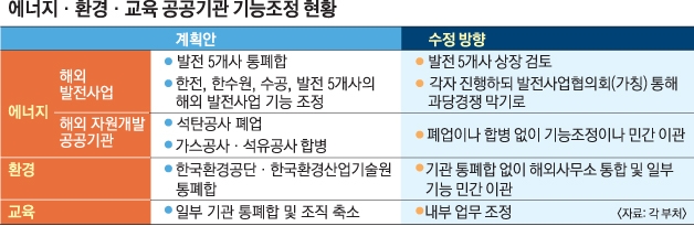 이에 따라 정부는 해외자원 및 발전 사업 진출과 관련해 구조조정에 가까운 강도 높은 에너지 공기업 기능 조정안을 검토해 왔다. 한전이 검토하고 있던 해외 발전 사업 투자를 단계적으로 50%까지 줄이고, 가스공사와 석유공사를 합병하고, 십수년째 적자만 쌓여 가는 석탄공사의 폐업도 계획했다.