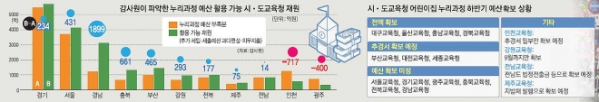 감사원에 따르면 경기도의 경우 본예산에 반영되지 않은 순세계잉여금 1088억원, 목적예비비 614억원, 지방세 정산분 1997억원 등 추가 세입 5823억원과 본예산에 과다 편성된 사업비 375억원을 합치면 5693억원이나 여력을 확보할 수 있는 것으로 확인됐다. 따라서 누리과정에 5459억원을 쓰고도 234억원이 남는다. 서울시의 경우에는 본예산에 반영되지 않은 순세계잉여금 1174억원, 목적예비비 등 정부지원금 181억원, 지방세 정산분 1559억원 등 추가 세입 3090억원과 본예산에 과다 편성된 사업비 1122억원(집행 잔액 인건비 553억원, 시설비 529억원) 등을 감안하면 여력이 4120억원 정도여서 누리과정 예산 3689억원에 견줘 431억원 많다는 것이 감사원의 지적이다.