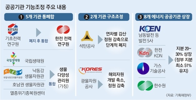 무리한 해외 자원 개발과 자원 가격 하락 등으로 부채비율이 무려 6905%로 치솟은 광물자원공사도 마찬가지다. 광물 비축이나 광물산업 지원 기능을 다른 기관에 넘기고, 공사는 민간기업들이 해외 자원 개발에 나설 때 컨설팅 등을 지원하는 기능만 수행하게 된다.
