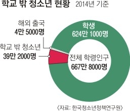 한국청소년정책연구원 등에 따르면 2014년 기준 학령기 청소년 668만명 가운데 39만 2000명이 학교 밖 청소년으로 분류된다. 2014년에만 5만 2000명이 학교를 그만뒀다. 지난해 연구원이 수행한 ‘학업 중단 청소년 패널조사 및 지원방안 연구’에서는 학교를 그만둔 청소년의 절반 이상이 계속해서 학업을 이어 나가길 원하는 것으로 나타났다.