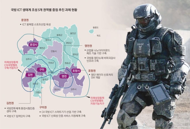 국내 첨단 정보기술(IT) 산업의 메카이자 유도무기·탄약 분야의 최대 생산기지인 구미권에는 2021년까지 900억원을 투입해 국방 ICT 스마트기기 산업 기반이 조성된다. 국방 스마트 기술 개발 거점센터 구축, 전투용 바이오센서 및 생화학무기용 화생방 감지센서 등 국방 스마트 센서 기술 개발을 위한 테스트베드 구축, 전자 전투복 및 스마트 방탄 헬멧 등 장기 운용을 위한 스마트 배터리 개발, 지역 산·학·연·관을 연계한 국방 스마트기기 육성 등 다양한 사업이 추진된다. 금오공대 ICT융합특성화연구센터는 이미 구미 지역 방산업체들과 협력해 ICT 융합 신기술, 신제품 개발 등을 적극 추진하고 있다. 방위사업청은 최근 구미종합비즈니스지원센터 회의실에서 국방 중소기업 지원을 위해 무기체계 개조 개발 및 국방벤처 지원, 해외 방산시장 정보 제공 등의 설명회를 가졌다. 구미국가산업단지에는 우리나라 유도무기의 60%와 탄약 40%를 생산하는 LIG 넥스원과 한화탈레스 등 대기업과 협력업체 260여개가 밀집돼 있다.