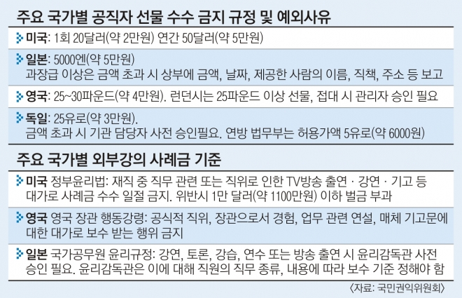 미국, 영국 등은 공직자가 직위로 인한 외부 강의 사례금을 받는 것을 아예 금지하고 있다. 미국 정부윤리법에 따르면 공직자가 재직 중에 TV방송 출연, 강연, 기고 등의 대가로 사례금을 받으면 1만 달러(약 1100만원) 이하의 벌금에 처해진다. 영국은 장관 행동강령에 이를 규정하고 있다. 일본은 외부 강의 사례금 기준을 따로 규정하고 있다. 국가공무원 윤리규정에 기관별 윤리감독관이 직원의 직무 종류, 내용에 따라 외부 강의에 대한 보수 기준을 정하도록 했다.