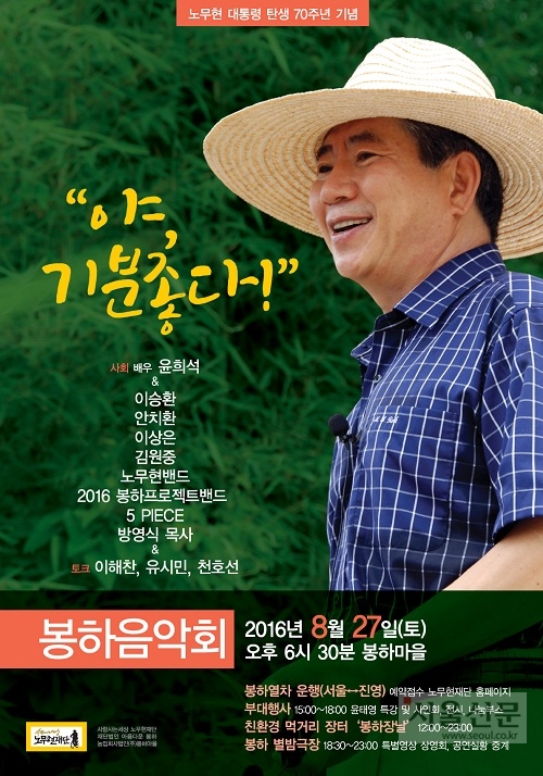 올해 음악회는 노 전 대통령이 대통령 임기를 마치고 고향인 봉하마을로 귀향하면서 소감으로 밝혔던 ‘야, 기분 좋다’를 주제로, 2시간 30분 동안 진행될 예정이다. 가수 이승환을 비롯해 안치환, 이상은, 김원중 등이 노래를 들려준다. 전 보건복지부 장관인 유시민 작가와 전 국무총리 이해찬 노무현재단 이사장, 천호선 전 정의당 대표 등이 ‘이 시대에 필요한 노무현의 가치’를 주제로 무대에서 이야기를 나눈다. 노사모의 실력파 밴드인 ‘노뺀’을 비롯해 봉하마을에서 근무하는 의경들로 구성된 ‘2016 봉하프로젝트 밴드’, 부산 종교평화회의 공동대표 방영식 목사, 김해 청소년들로 구성된 금관 5중주 팀 등이 공연한다. 사회는 배우 윤희석이 맡는다. 참여정부 때 청와대 대변인을 지낸 윤태영 노무현사료연구센터장의 책 사인회 및 특강을 비롯해 ‘별밤극장’, ‘소원 풍등 띄우기’ 등 여러 부대 행사가 마을 곳곳에서 열린다.