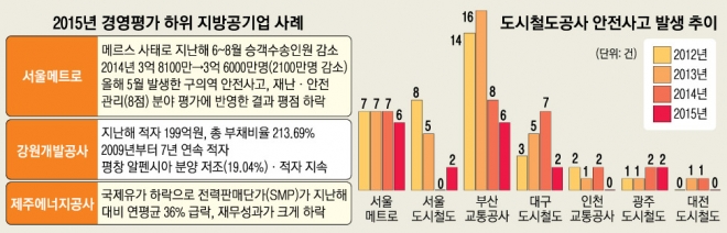 2014년과 지난해 경영평가에서 ‘다’등급이었던 서울메트로는 올해 7개 도시철도공사 가운데 유일하게 ‘라’등급을 받았다. 행자부는 “지난해 메르스(중동호흡기증후군) 여파로 특히 지하철 2호선의 수송인원이 급격히 감소한 데다 구의역 스크린도어 안전사고가 평가에 영향을 미쳤다”며 “이번 경영평가에서는 고용안정, 청년일자리 창출 등을 비롯해 재난·안전관리 지표를 강화했다”고 설명했다.
