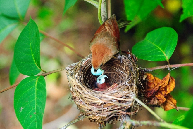 낙동강유역환경청은 16일 뻐꾸기가 붉은머리오목눈이 둥지에 몰래 낳은 알이 붉은머리오목눈이 알과 함께 부화되는 뻐꾸기의 독특한 번식·생존 방식인 ‘탁란’(托卵·deposition) 과정을 담은 사진을 공개했다.