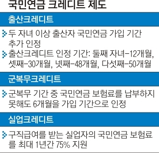 소득 유무와 관계없이 군 복무자, 다자녀가구에 혜택을 주는 크레디트 제도도 있습니다. 입대해 6개월 이상 병역의무를 수행한 사람은 ‘군 복무 크레디트’ 대상이 돼 국민연금 가입 기간 6개월을 추가로 인정받을 수 있습니다. ‘출산 크레디트’란 제도도 있어 둘째 자녀를 출산한 사람은 국민연금 가입 기간을 12개월 더 인정받을 수 있습니다. 셋째 자녀를 출산하면 인정 기간이 30개월로 늘어납니다. 가입 기간이 늘기 때문에 그만큼 노후에 받을 연금도 많아집니다.