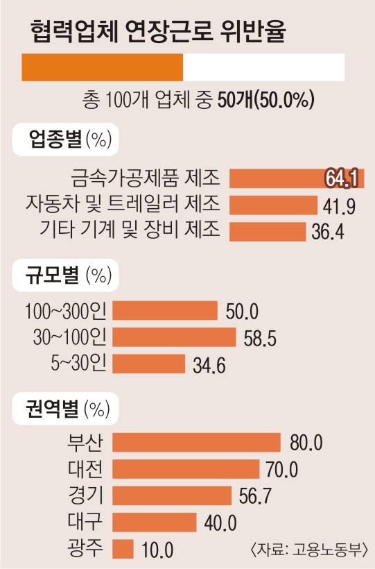 고용노동부는 지난 5~7월 자동차·금속가공·기계·고무·섬유 분야 2·3차 협력업체 100곳을 수시 감독한 결과 50곳이 연장근로 한도(주 12시간)를 초과해 일을 시킨 것으로 조사됐다고 23일 밝혔다. 업종별로는 ‘금속가공제품 제조업’의 연장근로 규정 위반율이 64.1%로 가장 높았다. 규모별로는 30~100인 사업장 위반율이 58.5%, 지역별로는 부산과 대전 권역 위반율이 각각 80%와 70%로 압도적으로 높았다.