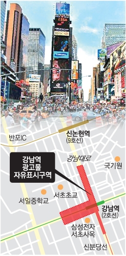 따라서 강남역 사거리를 중심으로 삼성사옥, GT타워 등 대형 빌딩이 밀집한 서초대로 일대를 광고물 자유표시구역의 중심지로 만들 예정이다. 강남대로 9호선 신논현 방면의 일부 구역도 포함한다.