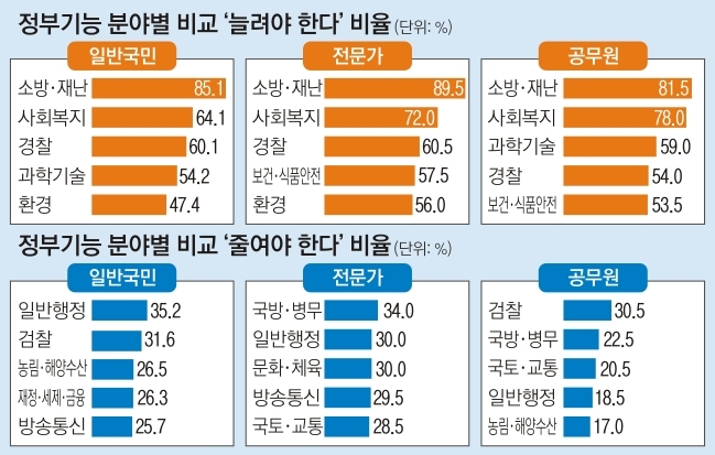 이번 조사는 전국의 성인 1049명과 대학 행정학과 교수, 연구원 등 전문가 200명, 중앙부처 기획조정관실 공무원 200명을 대상으로 이메일(복수응답)로 진행됐다. 설문에 응답한 일반국민, 공무원, 전문가의 80.0% 이상이 공무원 증원이 가장 필요한 정부기능 분야로 소방·재난을 택했다. 사회복지와 경찰 분야가 뒤를 이었다. 반대로 공무원 규모를 줄여 기능을 축소해야 한다고 보는 분야에서는 응답이 갈렸다. 일반국민은 일반행정, 검찰, 농림·해양수산 등의 순으로 꼽았고, 전문가는 국방·병무, 공무원은 검찰을 선택했다.