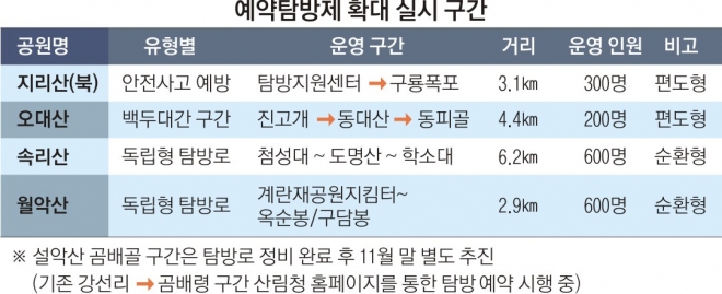탐방예약제로 운영되는 국립공원은 지리산 칠선계곡과 노고단, 북한산 우이령 구간 등 8곳으로 늘었다. 지리산 칠선계곡(9.7㎞)은 5~6월, 9~10월 매주 2회 운영한다. 노고단(0.5㎞)은 7~10월 하루 3회 탐방 가능하다. 자연 자원 보호를 위해 북한산 우이령길(4.5㎞)은 탐방 인원을 하루 1000명으로 제한하고 있다.