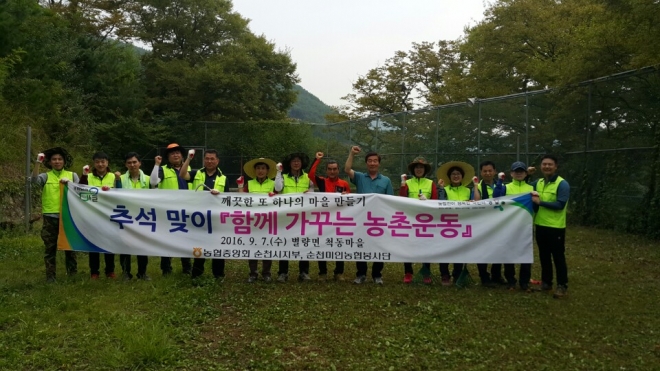 농협중앙회 순천시지부가 7일 순천지역 농협직원들로 구성된 순천미인 농협봉사단과 함께 별량면 척동마을 일대에서 또 하나의 마을만들기 하나로 추석맞이 ‘함께 가꾸는 농촌운동’을 전개했다. 민족의 대명절인 한가위를 맞아 마을 대청소를 실시함으로써 귀향객들이 깨끗하고 편안하게 고향의 정취를 느낄 수 있도록 한 취지다.