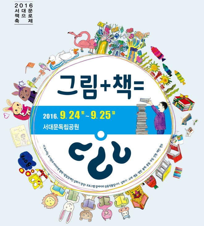 서대문구는 주말인 24~25일 서대문독립공원과 서대문구립이진아기념도서관 일대에서 ‘2016 서대문 책으로 축제’를 연다고 20일 밝혔다. 올해로 다섯 번째 열리는 이번 축제 주제는 ‘그림+책=???’인데 ‘그림책은 당신에게 어떤 의미인가요?’란 질문을 담고 있다.