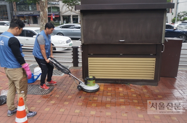 21일 강남구에 따르면 강남대로 등 지역의 17개 간선도로, 178곳의 가로 판매대, 구두수선대 등 허가노점 주변을 주로 정비한다. 구는 우선 노점 주변환경에 대한 실태조사를 하고 노점 운영자들과 협의를 거쳐 자율정비를 꾀한 뒤 구에서 장비·인력을 지원해 정비에 나설 계획이다. 노점 시설물과 주변 보도를 물 세척하고, 오래되거나 매연으로 찌든 곳을 구석구석 청소한다. 시설물 주변 보도블럭이 훼손된 곳도 보강한다. 유동인구가 많고 문화·상업 시설과 허가 노점이 밀집된 강남대로부터 환경미화를 한 뒤 이어서 주요 간선도로변을 순차적으로 정비할 계획이다. 앞서 올봄 강남구는 일반 규격노점 11곳에 대한 전면 도색 및 시설물 정기 물 세척에 나서는 등 거리환경에 신경 써왔다.