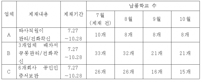 서울시내 일부 학교들이 교육청에 적발되어 제재를 당한 업체들과의 수의 계약을 해지하지 않고 계속하여 식재료를 납품받고 있는 것으로 나타나 충격을 주고 있다.
