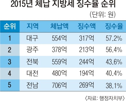 권역별로 보면 수도권은 22.3%로 전국 평균을 밑돌았다. 체납액 규모가 큰 데다 채권을 확보하기 힘든 지방소득세 중 78%를 차지하는 현실이 반영된 것이다. 높은 징수률을 기록한 지자체들은 시·군·구 협업체계를 통한 고액 체납자 전담관리제 운영, 악성 체납자의 가택 수색에 따른 동산 압류 등 총력을 다한 덕분이었다.