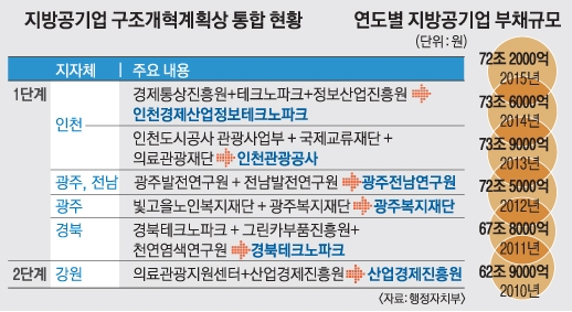 지방공기업 부채 감축을 거쳐 건전성도 다졌다. 2015년 결산 결과 중점관리기관 부채를 49조 9000억원에서 47조 7000억원으로 줄였다. 총부채도 2013년 73조 9000억원, 2014년 73조 6000억원, 지난해 72조 2000억원으로 2년 잇따라 감소했다. 지난해 부채 비율은 65.2%로 2008년 이후 7년 만에 60%대를 달성하기도 했다.