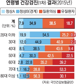 ‘정상’ 판정자는 2011년만 해도 전체 수검자의 절반에 가까운 49.4%였지만 2012년 47.7%, 2013년 46.5%, 2014년 44.5%로 점점 떨어져 지난해에는 2011년보다 6.6% 포인트나 줄었다. 해가 갈수록 우리 국민의 건강 상태가 나빠지고 있다는 의미다. 건강보험공단은 “인구 고령화로 고령층 검진 대상자가 늘어난 까닭으로 보인다”고 해석했다.
