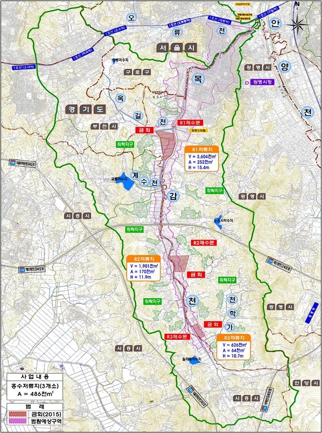목감천 치수대책사업은 하류부 도심구간의 홍수위험을 낮추는 방식이 핵심으로 3307억원의 사업비가 투입될 전망이다. 중류부에는 홍수 때 물을 일시 가뒀다가 하류로 흘려보내는 ‘홍수저류지’가 설치되고, 중·상류부 비도심 구간에서는 제방을 확장하게 된다. 내년 상반기 사업추진이 최종 확정되면, 2018년 12월 말까지 실시설계를 거쳐 2019년부터 보상 및 착공에 들어간다.