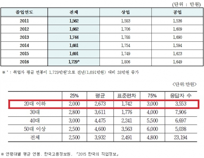 특성화고 졸업자들의 2016년 평균연봉은 1,729만원으로, 월평균 세전 144만원의 임금을 받고 있고, 제출된 자료는 특성화고와 마이스터고를 합산한 것이라 특성화고만의 평균연봉은 더 떨어질 것으로 예상된다.
