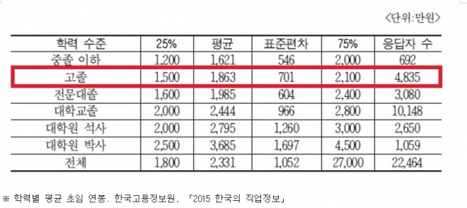 2015년 특성화고 졸업자 평균 연봉은 1,691만원으로 올해 9월 한국고용정보원에서 발표한 ‘2015년 20대 평균연봉’ 2,673만원에 비해 982만원이 적고 ‘2015년 고졸자 평균 초임 연봉’ 1,863만원에 비해 2015년 특성화고 졸업자 평균 연봉은 1,691만원으로 172만원이 적다.