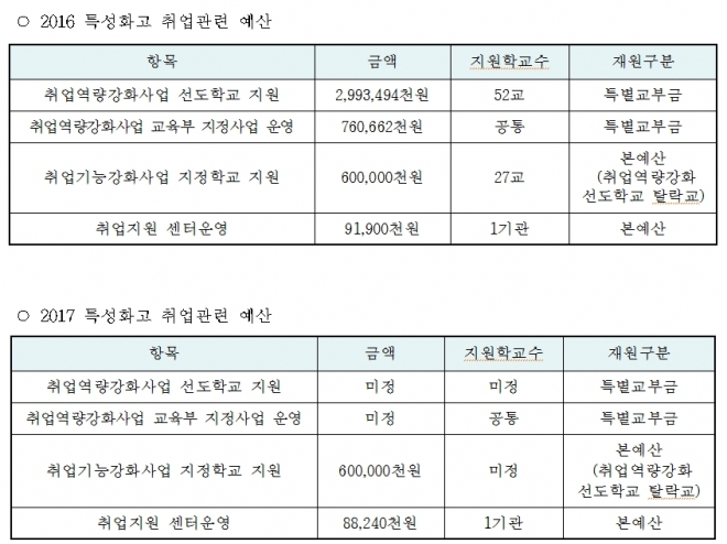 2016년 대비 2017년 관련 예산도 취업지원 센터운영비가 소폭 감소했고, 지원 학교수와 지원 금액은 아직 확정되지 않은 상태다.