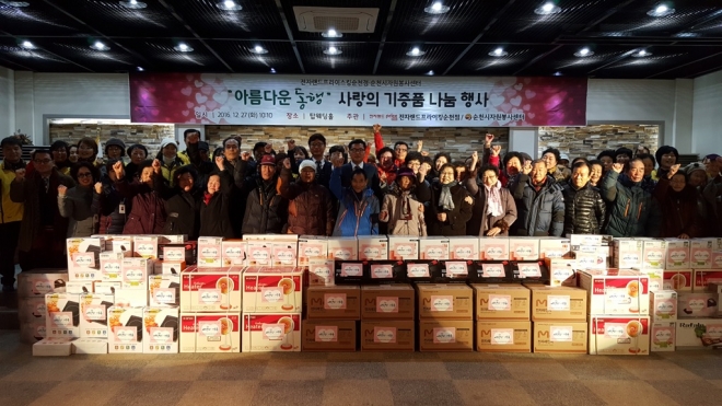 전남 순천시자원봉사센터가 27일 전자랜드프라이스킹 순천점과 함께 지역 소외계층 150명에게 전자제품 120점 등 1500다여만원어치의 물품을 전달했다.