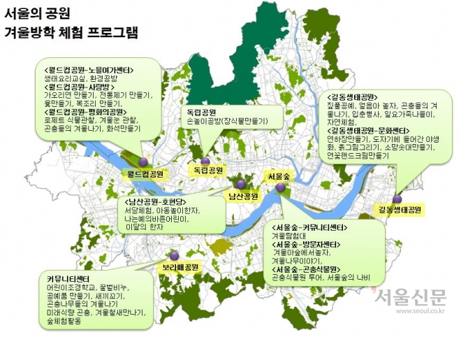 신나는 겨울방학 따뜻한 집안에서 TV보고 컴퓨터 게임 하는 것도 좋지만 자연을 느낄 수 있는 체험 프로그램은 어떨까. 상쾌한 겨울 공기를 쐬며, 다양한 창작물을 만들고 뛰어다녀보자. 서울시 6개 공원에서 39개의 프로그램을 마련, 겨울방학을 맞은 아이들과 학부모들을 기다리고 있다.