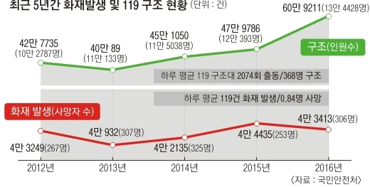 국민안전처가 12일 발표한 ‘2016년 소방 및 119 구조·구급활동 현황’에 따르면 지난해 전국 4만 3413건의 화재로 2024명의 인명피해(사망자 306명)와 3697억원의 재산피해(대구 서문시장 화재 제외)를 입었다.