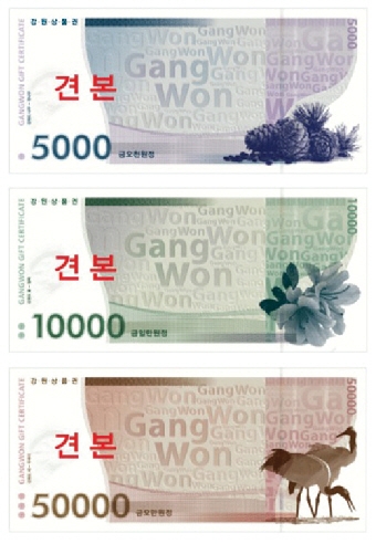 강원도는 관련 조례 시행규칙 제정·공포와 함께 사용점 모집에 들어가 지난해 말 30억원 규모를 발행했다. 올해 안에 250억원 규모의 상품권을 추가 발행한다는 계획이다. 상품권 발행은 5000원권, 1만원권, 5만원권 등 3종이다. 도는 지역기관·단체 포상금, 시상금, 물품 구매 등 위주로 유통을 늘리고 강원도 발주사업과 주력산업인 관광상품 패키지화, 모바일 쇼핑몰 등과 연계해 유통을 확대하고 있다.