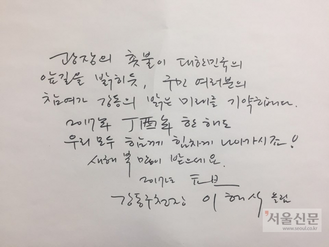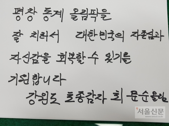 최문순 강원도지사의 글씨체에는 ‘유머’가 숨어 있다. 구 변호사는 “필체가 둥글둥글하면 모나지 않은 성격일 가능성이 높다”면서 “글씨에 멋 내려 한 흔적이 없어 성품도 꾸밈없을 것으로 보인다”고 말했다. 이시종 충북지사의 글씨체도 곡선이 두드러져 부드럽고 관대한 성품이 드러난다.