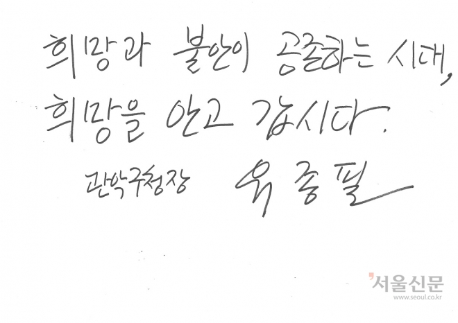 구청장 중 가장 에너지 넘치는 글씨체의 소유자는 유종필 관악구청장이다. 글씨가 크고 ‘필’자의 ‘ㄹ’을 길게 빼 활력 넘쳐 보인다. 또, 행 간격이 넓은데 이는 외향적인 사람의 특징이다. 하지만 한 글씨가 다른 글씨를 침범하기도 하는데 성격이 다소 급할 가능성이 있다. 구 변호사는 “표현하는 것을 즐기는 스타일로 보인다”고 말했다.