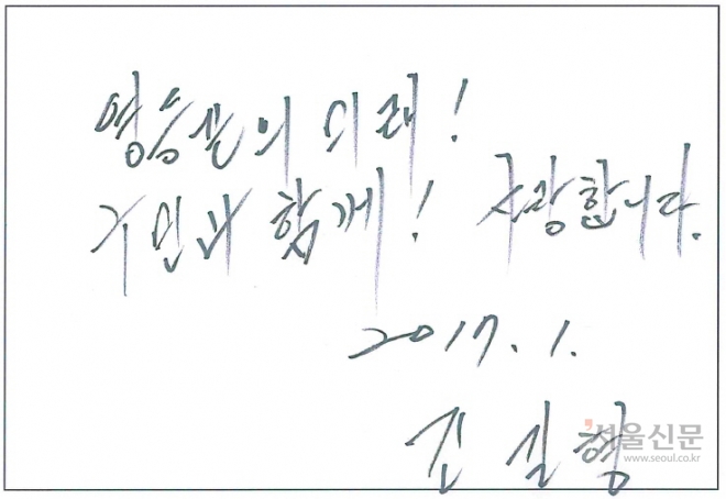 남경필 경기지사의 필체에서도 강한 에너지가 엿보인다. ‘필’자의 ‘ㄹ’을 가로로 쭉 빼 썼는데 에너지 넘치는 필체의 특징이다.