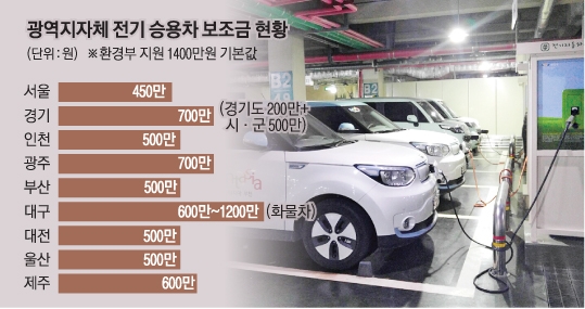 전남은 22개 시·군 중 9개 시·군에서 전기차 보조금 혜택을 주고 있다. 올해 모두 473대가 보급된다. 순천시와 고흥군은 800만원, 여수시와 나주시·광양시·영광군·해남군은 각각 500만원, 완도군 400만원, 화순군은 300만~700만원을 차등 지원한다. 울산시는 올해 모두 50대(대당 500만원)의 전기자동차 구매 보조금을 지원키로 하고 최근부터 해당 자동차 판매점 등에서 신청서를 접수하고 있다. 부산시는 500대를 보급하고, 대당 500만원을 지원한다. 이 밖에 각 지자체는 새로 짓는 공동주택에 충전소 설치를 의무화하는 등 전기차 보급 확대를 위한 각종 제도 개선에 주력하고 있다.