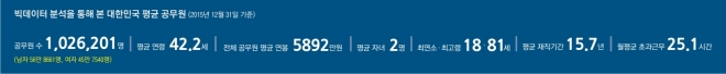 빅데이터를 돌려 찾아낸 대한민국 평균 공무원은 한마디로 이렇게 요약된다. 공직사회의 현주소를 들여다보면 국가공무원과 지방공무원, 남성과 여성, 9급에서 1급까지 다양한 직급의 공무원이 존재하는 복잡한 세계지만 빅데이터로 평균 공무원의 초상을 그려 봤다. 이를 대한민국 국민의 평균과 다시 비교해 공무원들의 위치를 가늠해 보았다.