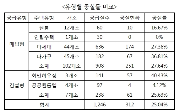 실제로 희망하우징 중 대다수인 102개소가 매입형으로 공급되고 있는데, 이 중 원룸형의 공실률은 17% 수준인데 비해, 다세대형은 27%, 다가구형은 37%로서 유형에 따라 공실률에 큰 차이가 있는 것으로 나타났다. 그러나 입‧퇴거 시 사유에 대한 설문조사나 입주해 있는 동안의 주택유형별 만족도 조사 등은 지금까지 이루어진 바가 없어 공급 대비 관리에 큰 허점이 있는 것으로 나타났다.