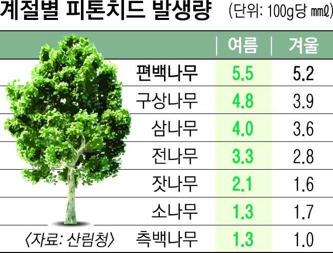 일본이 원산지인 편백은 히노키 탕, 히노키 가구, 히노키 베개 등에 쓰이고 있다. 편백에서 발생하는 피톤치드의 단위당 발생량은 소나무, 잣나무보다 월등하다. 아토피 알레르기 등 피부질환 치료에 탁월한 효과가 있고, 나쁜 냄새를 없애 주고 유해물질을 중화시켜 주는 것으로 알려졌다.