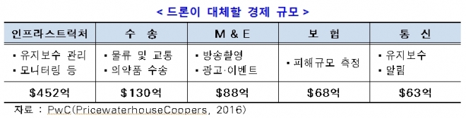 항공산업에서 드론시장은 아직 1.1%에 불과하지만, 지난해 9월 미국 백악관은 향후 10년간 820억 달러의 경제적 이익과 10만개 이상의 일자리를 창출할 것으로 전망한바 있다. 글로벌 회계컨설팅기업인 프라이스워터하우스쿠퍼스(PriceWaterhouseCoopers) 역시 드론이 대체할 경제 규모도 800억 달러가 넘을 것으로 분석했다.