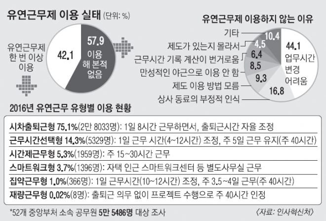 앞서 정부는 2010년 획일화된 근무 형태를 다양화해 공직사회의 생산성과 사기를 높이겠다는 취지로 유연근무제를 처음 도입했다. 근무 시간, 장소, 형태를 기준으로 구분되는 유연근무 유형은 모두 7가지이지만 이용률은 저조하다. 인사처에 따르면 지난해 교원, 교대·현업 근무자를 제외한 국가공무원 16만 9000명 가운데 유연근무 이용자 비율은 22%(3만 7301명)에 그친다. 지난 3년간 이용률을 살펴보면 2013년 14.8%, 2014년 16.1%, 2015 18.9%로 높아지는 추세이긴 하나 여전히 미미한 실정이다.